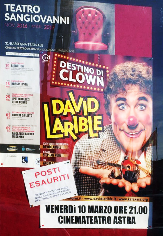 In occasione della replica, il 10 marzo, del nuovo show Destino di Clown, l'11 e 12 marzo il Teatro Astra di San Giovanni Lupatoto ospiterà poi un workshop sul clown poetico, una full-immersion nelle tecniche del pagliaccio classico più famoso al mondo.